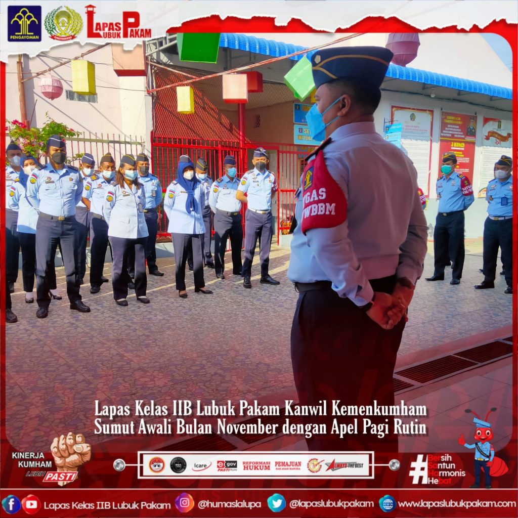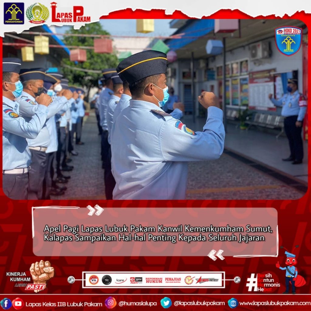 Lubuk Pakam - Senin, 25 Oktober 2021, Rutinitas Apel Pagi merupakan rangkaian kegiatan yang wajib bagi setiap Pegawai Lapas Kelas IIB Lubuk Pakam Kanwil Kemenkumham Sumut. Selain untuk mendengar arahan pimpinan, apel pagi juga bermanfaat untuk mempersiapkan kegiatan-kegiatan kedepannya, kedisiplinan...