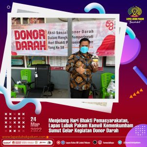 Dalam rangka menyambut Hari Bhakti Pemasyarakatan (HBP) ke-58, Lapas Lubuk Pakam Kanwil Kemenkumham Sumut menggelar kegiatan donor darah. Kegiatan ini diselenggarakan pada hari Kamis, 24 Maret 2022. Bertempat di Lapangan Apel Lapas Lubuk Pakam.